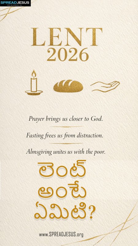What is Lent? లెంట్ అంటే ఈస్టర్ ముందు 40 రోజుల ప్రార్థన, ఉపవాసం మరియు పశ్చాత్తాప కాలం. Lent reflects Jesus’ 40 days fasting in the wilderness. ఎందుకు లెంట్ పాటిస్తారు? It helps believers grow spiritually and renew faith before Easter.