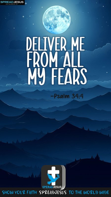 Psalm 34:4 Daily bible quote wallpaper for whatsapp Download “Deliver me from all my fears” from Psalm 34:4 as a Bible quote wallpaper and daily Christian status for strength and faith.