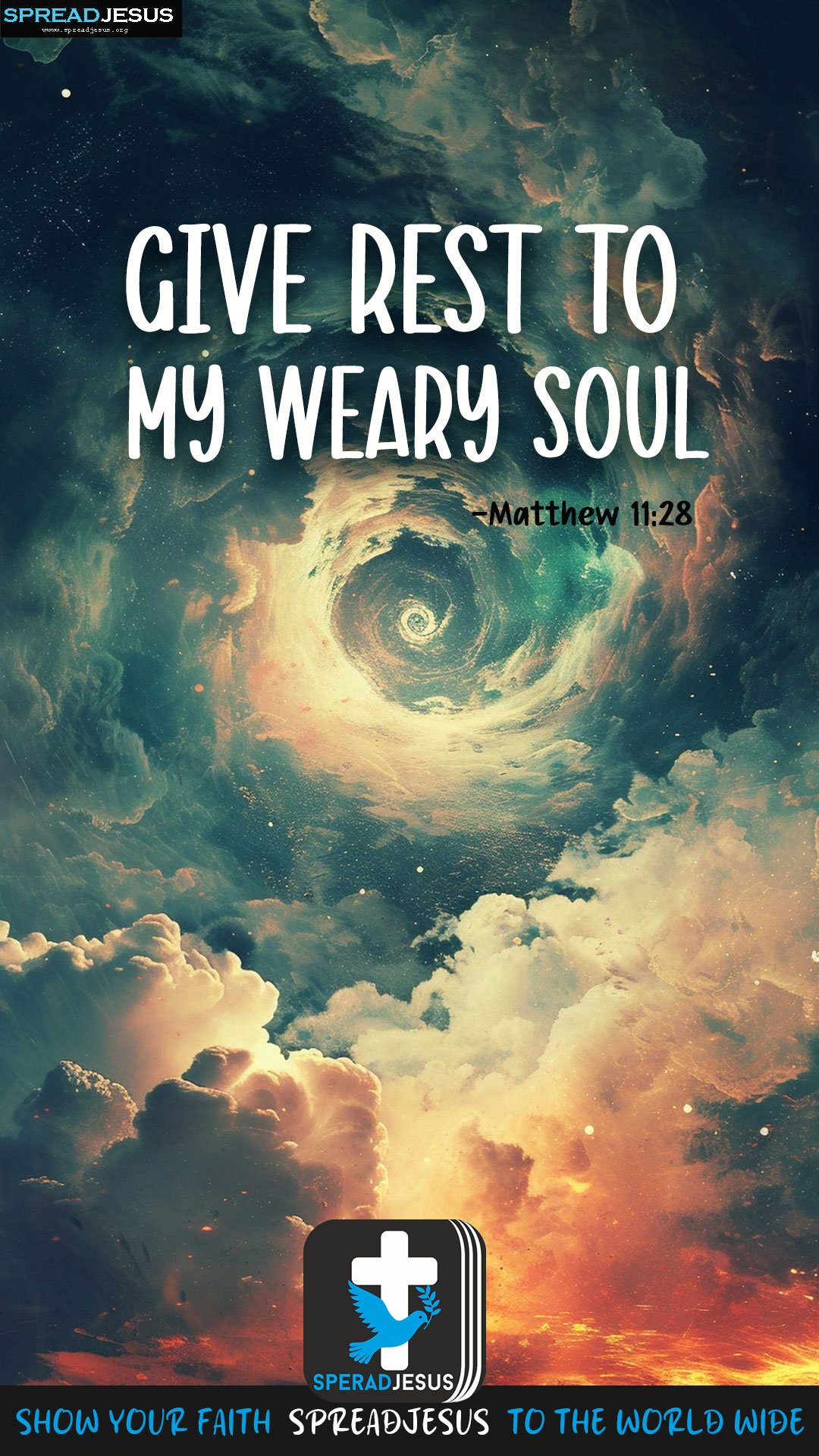 Matthew 11:28 Daily bible quote wallpaper for whatsapp status Download “Give rest to my weary soul” from Matthew 11:28 as a Bible quote wallpaper and daily Christian status for strength and faith. Daily Bible quote status | Christian WhatsApp status | Download HD Wallpapers Free
